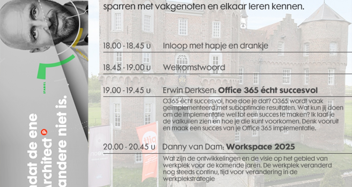 Ga samen met branche experts Erwin Derksen en Danny van Dam (MVP), in gesprek over actuele onderwerpen. Zij nemen je mee in hun ervaringen en ontwikkelingen binnen de wereld van Office 365 en Workspace 2025. De inspirerende locatie, Kasteel Croy, brengt je in ridderlijke sferen waar je op een ongedwongen manier kunt sparren met vakgenoten.