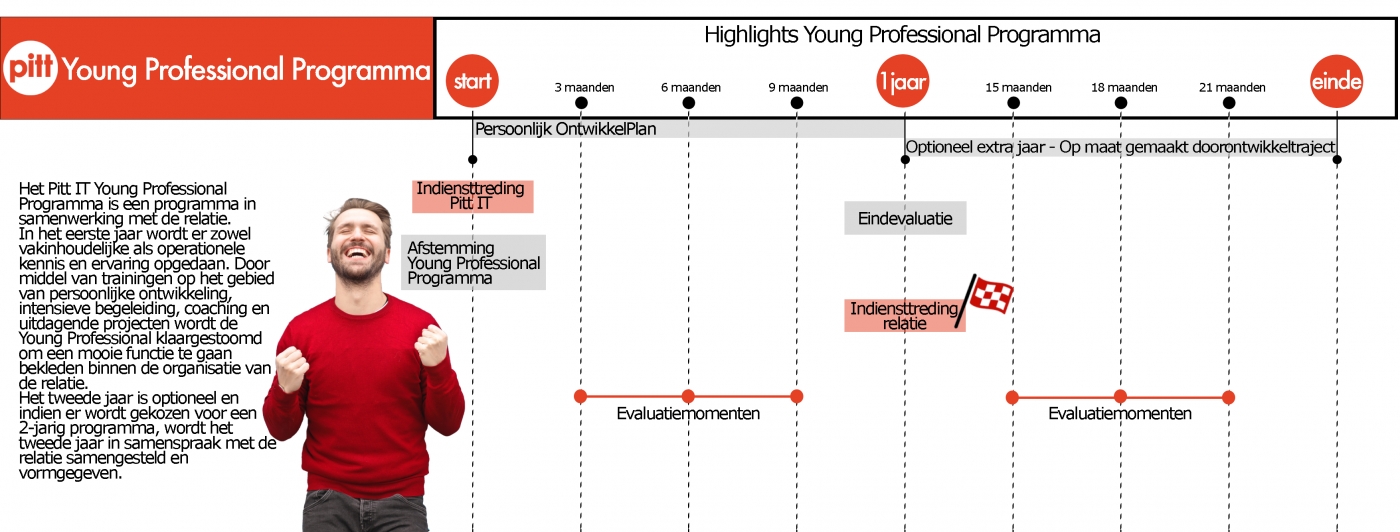 Ben jij (bijna) klaar met je technische hbo- of wo-studie en kijk je uit naar een vliegende start van jouw IT-loopbaan? Heb je maximaal twee jaar werkervaring en wil je ontdekken welke baan nu écht bij je past? Dan is het Young Professional Programma van Pitt-IT ideaal voor jou. Dit programma biedt je namelijk de ruimte om te ontdekken wat jij graag wil, terwijl je wel al een volwaardig salaris van ons ontvangt.